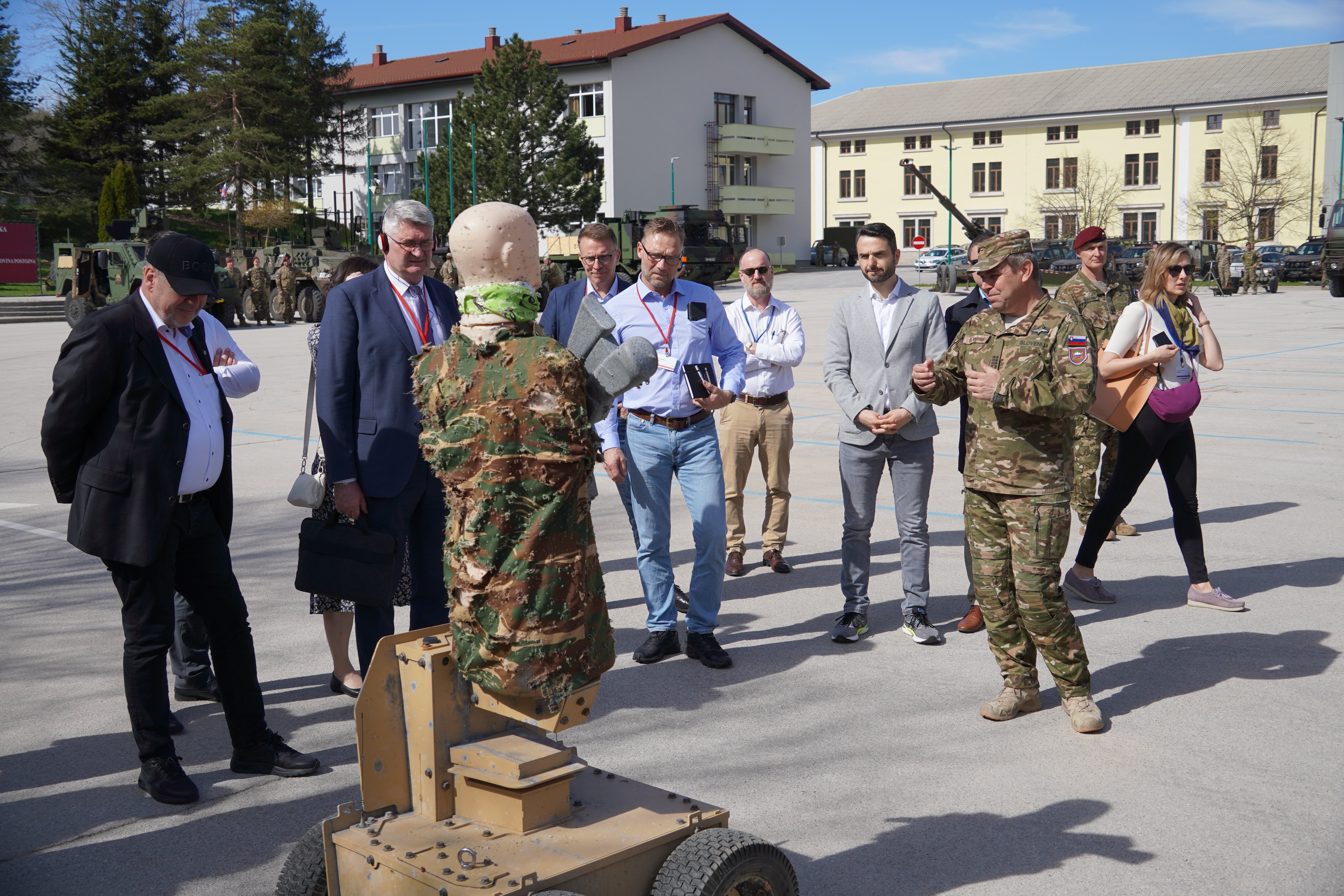 Delegacija je obisk nadaljevala na Osrednjem vadišču SV Postojna, kjer so si ogledali dinamično predstavitev voda taktičnih odzivnih sil iz 74. pehotnega polka. Pripadniki voda srednjih kolesnih oklepnih vozil 8×8 Svarun so na prikazni vaji s podporo minometov 120 mm nevtralizirali bunker, posadka helikopterja Bell iz 15. polka vojaškega letalstva pa je izvedla evakuacijo ranjenca.