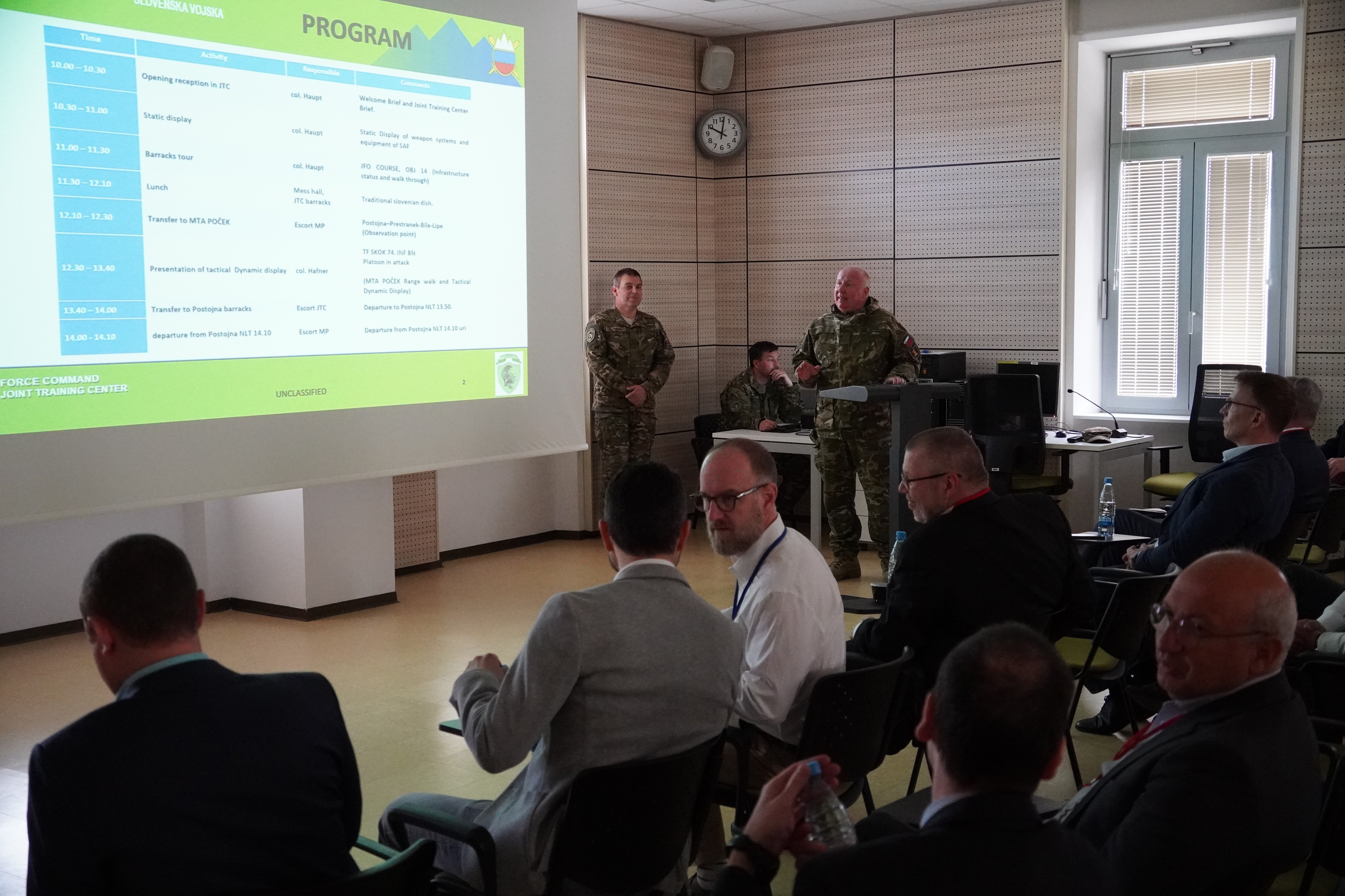 V Vojašnici barona Andreja Čehovina Postojna sta jih sprejela namestnik poveljnika sil Slovenske vojske polkovnik Igor Šepec in poveljnik Centra za združeno usposabljanje podpolkovnik Boško Haupt. V nadaljevanju so si ogledali oborožitev in opremo Slovenske vojske, posebno zanimanje je vzbudil slovenski brezpilotni letalnik Belin-V, ki omogoča vertikalni vzlet in pristanek.