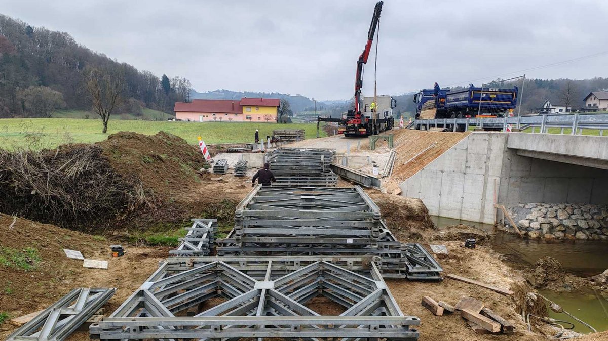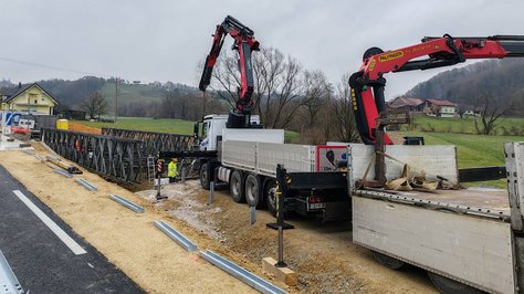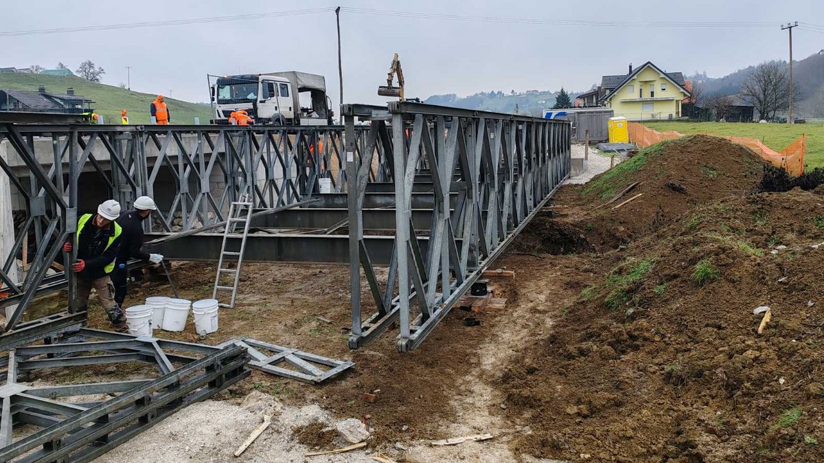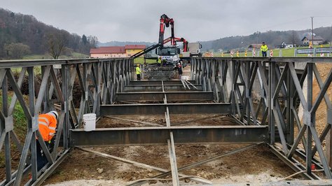 Inženirci Slovenske vojske do petka, 13. decembra, sodelujejo pri razstavljanju montažnega mostu. Razstavljanje mostu Mabey & Johnson C-200 dolžine približno 25 metrov čez potok Črna na cesti Videm - Zgornji Leskovec, ki je od septembra služil kot začasni obvoz med gradnjo nadomestnega, poteka skladno z zaprosilom Direkcije Republike Slovenije za infrastrukturo.