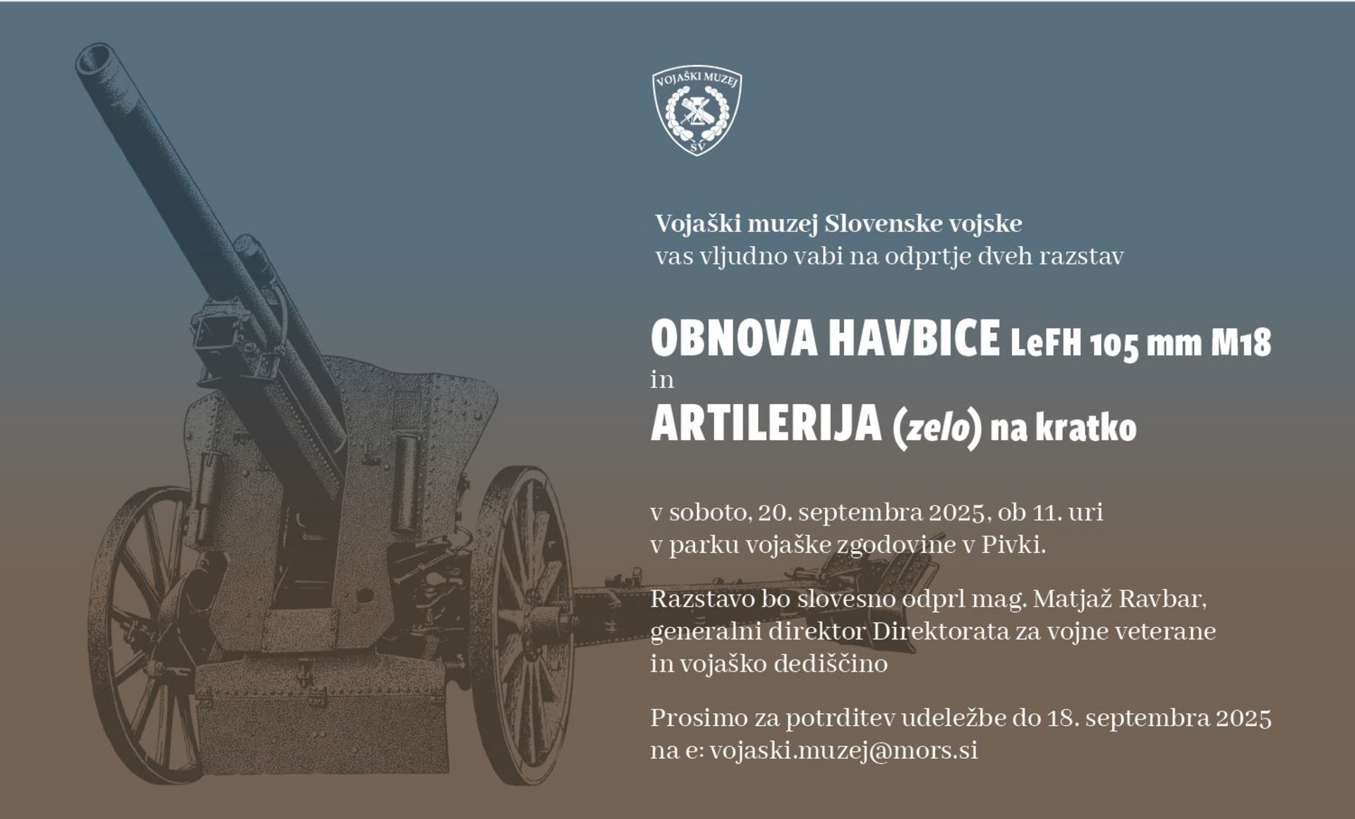 Vojaški muzej Slovenske vojske vabi na otvoritev priložnostnih razstav Obnova havbice LeFH 105 mm M18 in Artilerija (zelo) na kratko, ki bo potekala v soboto, 20. septembra, ob 11. uri v Parku vojaške zgodovine v Pivki.